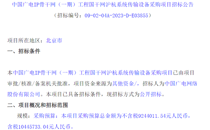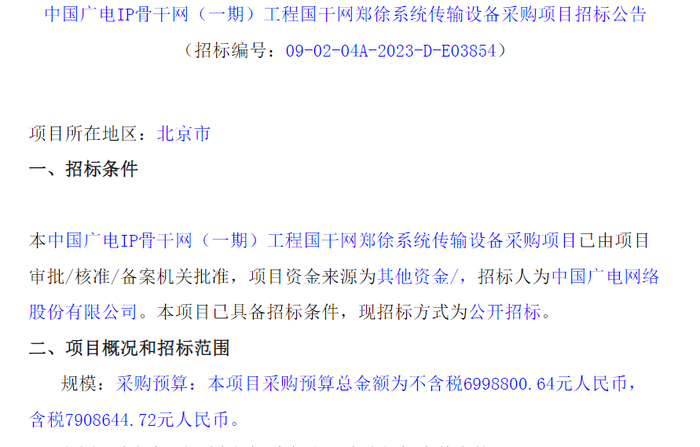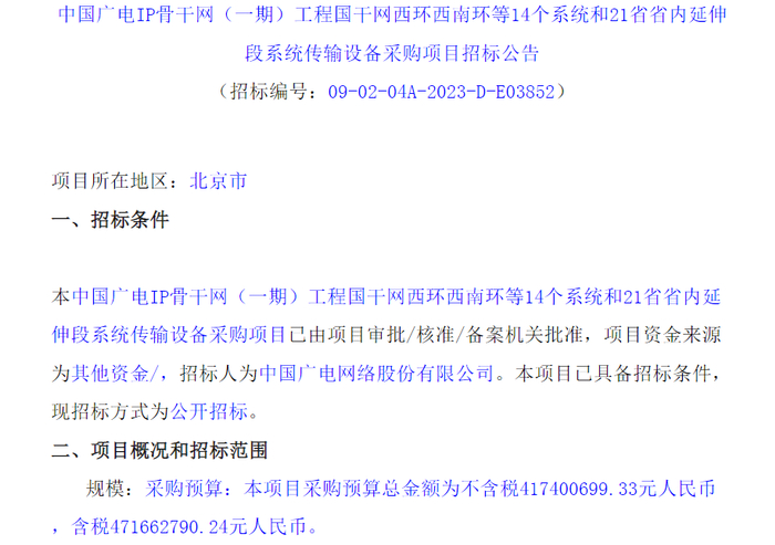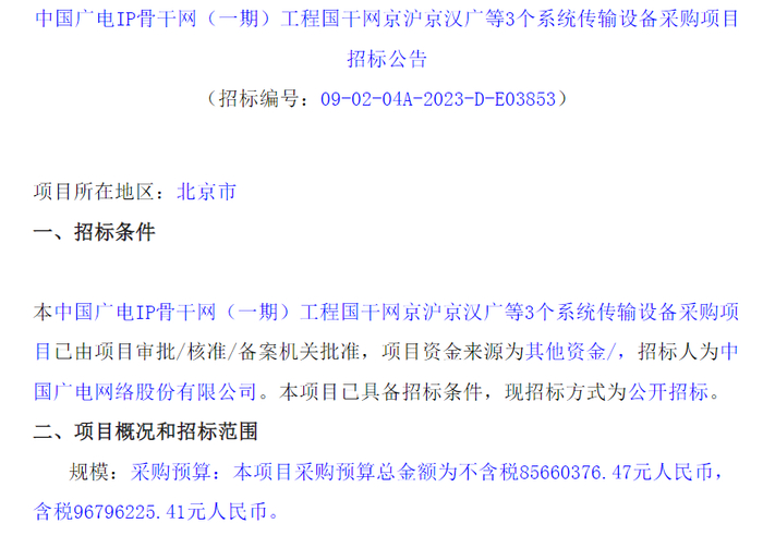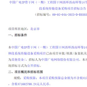 重磅!中国广电启动IP骨干网集采 金额接近6亿元