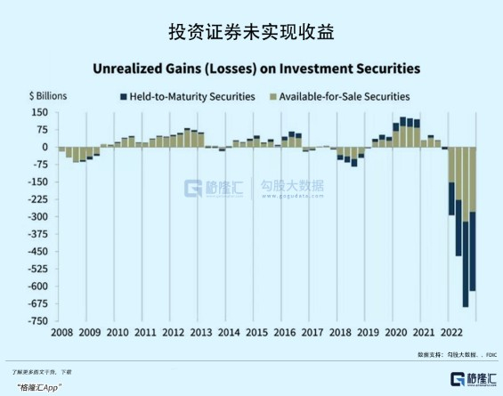 去年,美联储、欧洲央行、瑞士等全球重要央行账面都出现巨额亏损,因为它们持有大量国债,而去年国债价格暴跌。不过,不卖持有到期,亏损只是账面的,而不是真实的。除了央行们,美国银行业过去这么多年吞吐了大量国债。去年这些账面亏损并没有计入当期损益表中,而是放在了“可供出售和持有至到期证券”栏目下。
