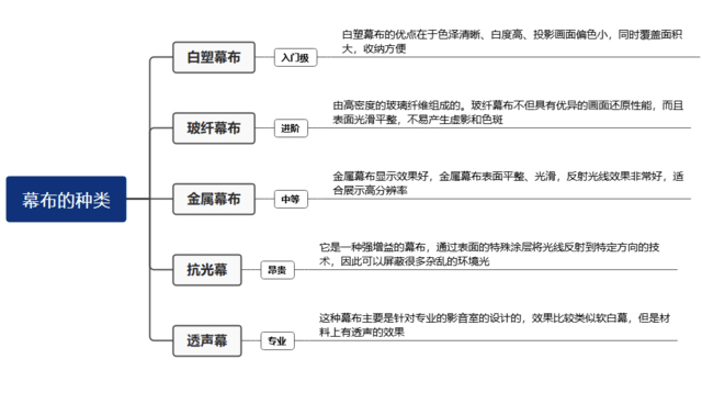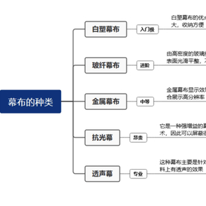 可以看到幕布仅仅是分类就是这么多。而幕布的材质一般人是很难分辨出来的。有不少厂家将白塑幕布当做软白幕去卖,消费者根本分辨率不了。另外还有将玻珠幕布当抗光幕卖的,把金属幕布当抗光幕卖的,甚至有的人本身就认为金属幕布就是抗光幕。