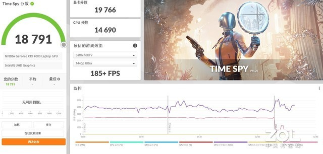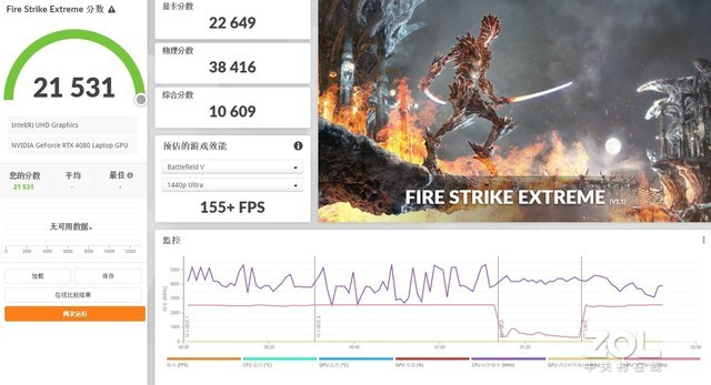 光追Port Royal评分高达12228,这意味着RTX 4080显卡已经完全拿下了光追特效,再也不用担心高分辨率下开光追帧数不足的问题了;Time Spy DX12测试模式评分19766分;Fire Strike Extreme DX11模式评分22649分,其综合图形性能已经把上一代的RTX 3080Ti都甩出了几条街的距离。