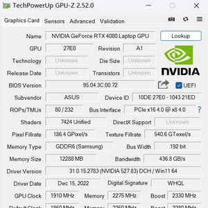 RTX 4080 Laptop GPU,支持独显直连技术。GPU功率175W,拥有7424个CUDA核心,12GB GDDR6显存,像素填充率186.4 GPixel/s,纹理填充率540.6 GTexel/s,总线位宽192bit,带宽速率436.8GB/s,核心频率1910MHz,显存频率2275MHz,Boost频率2330MHz,目前因为GPU-Z最新版本还无法完全检索出RTX 40显卡规格,所以参数可能有误。