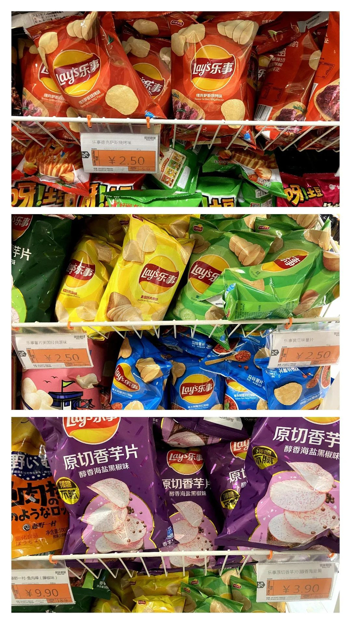 乐事薯片爱好者的天堂就是这里吧,2块5一包的乐事薯片,还有经典的原味、黄瓜口味。当然这么便宜也就预示着薯片保质期只到5月就过期了,千万别一口气买太多!冲动囤货容易人为造成一些食品安全问题。