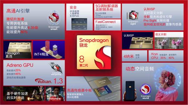 全新的第二代骁龙 8在备受好评的骁龙8+之上,再度改善了性能和功耗表现。基于创新“1+2+2+3”四簇架构,Kryo CPU 在性能上相比第一代骁龙8提升35%,同时能效提高达 40%。GPU方面,新一代Adreno GPU性能提升了 25%,能效提升高达45%。同时全新Adreno GPU首次支持Vulkan 1.3 API图形接口标准,让Vulkan性能提升高达30%。