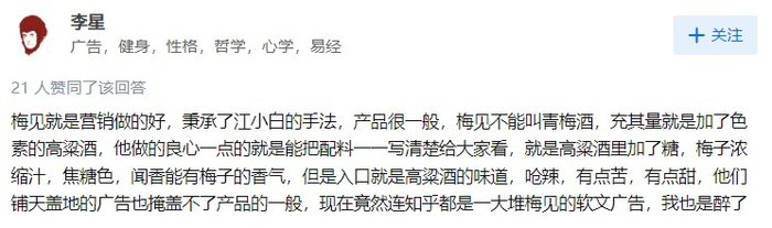 在网上也能看到不少对于梅见只注重营销而忽视产品口感的评价。梅见口感偏甜,前调是甜味,后调是有点后劲的高粱酒。虽然女性多偏好甜的口感,但是梅见酒的甜度有点过了;对男性来说这个甜度就更不用说了。