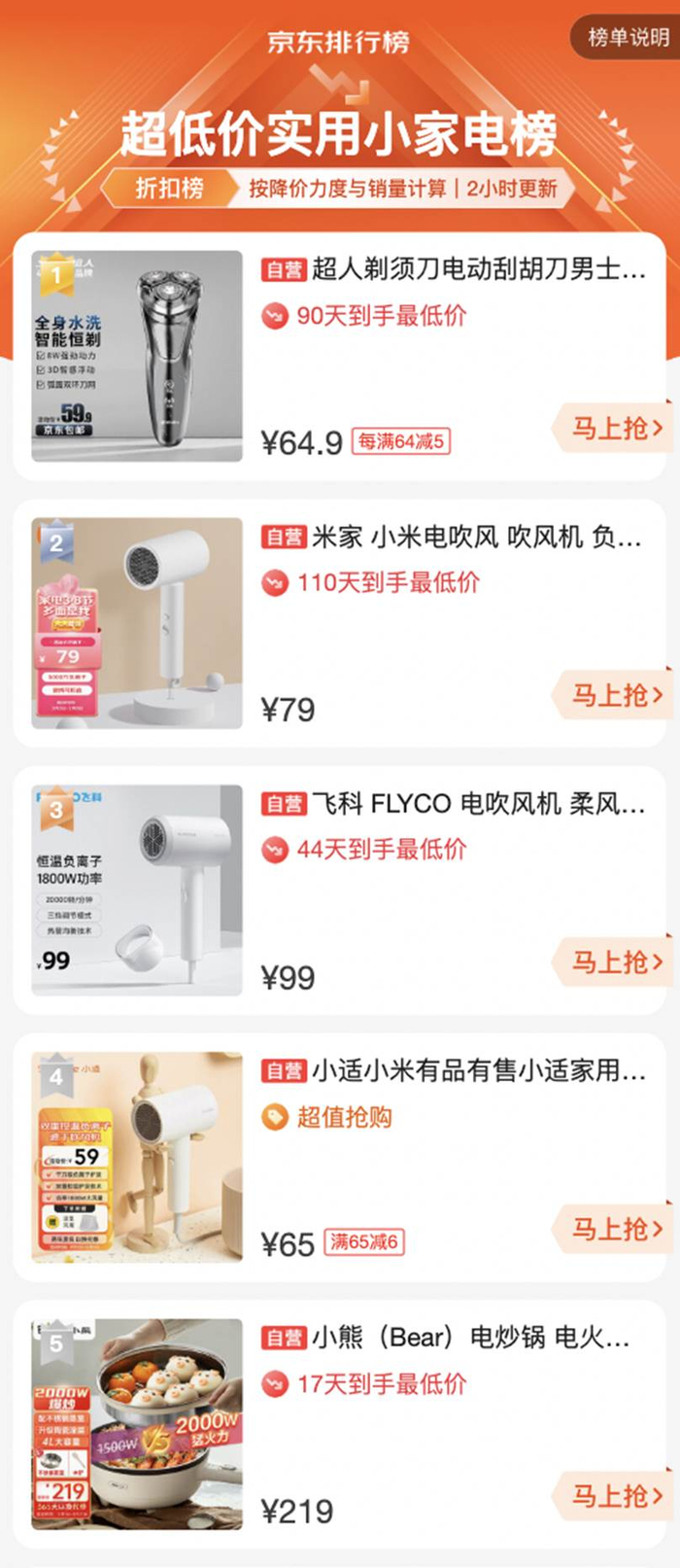 以上为大家推荐的小家电好物,不但满足了不同家庭场景所需,价格也是相当实在,不仅如此,在京东超低价实用小家电排行榜中还有众多小家电好物等待你选购,榜单按照降价力度与销量每2小时更新,如果你想入手一款合适的小家电产品,那一定要关注榜单信息,可别错过心仪好物哦。