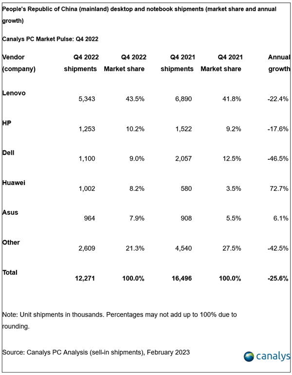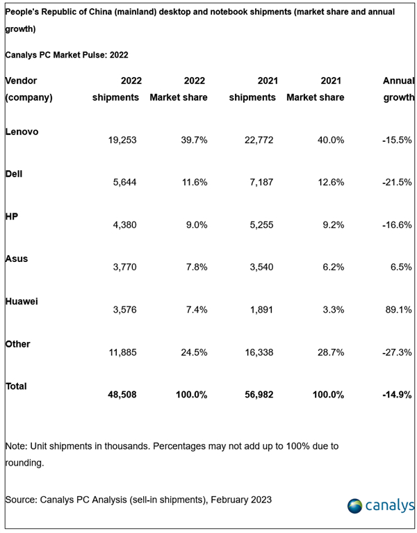 Canalys:2022年全年PC市场出货量为4850万台 同比下降15%