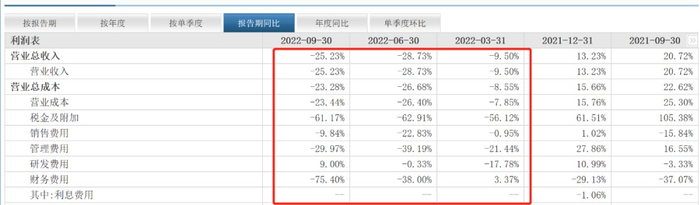 其中东风日产今年1-2月累计销售10.1万辆,同比下滑52.5%;东风本田前2个月仅销售6.2万辆,同比下滑54.8%。东风汽车的销量正以肉眼可见的速度在急速下滑。财报同时显示(如下图)整个2022年三个季度几乎所有数据指标值都出现不同程度的下滑。