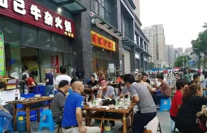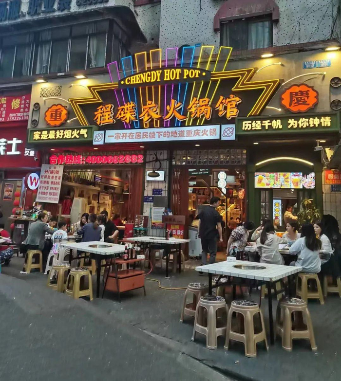 成都有个“付一八火锅”,主打重庆火锅,一开业就上外摆——筒子楼实在地方太少,并且生意一直很火爆;
