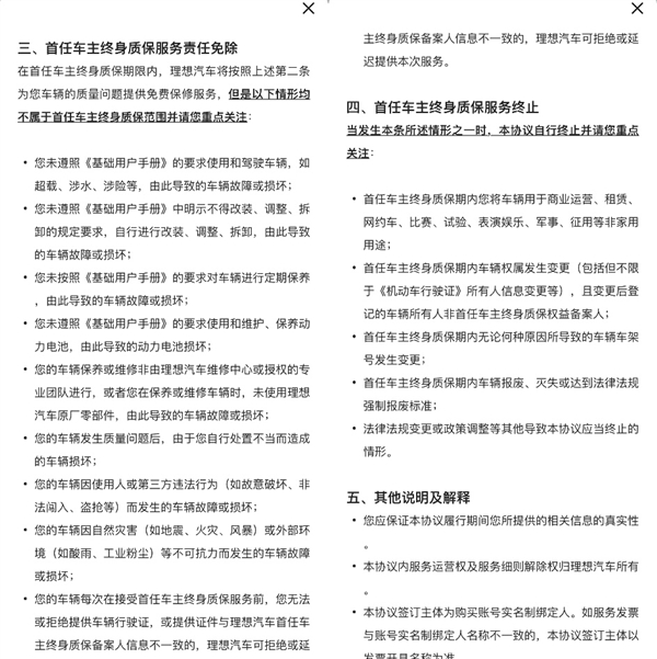在理想汽车的“首任车主终身质保服务协议”中的责任免除部分,就列出九条情形是不属于终身质保范围内的。另外,还有五条情形会导致终身质保服务终止——