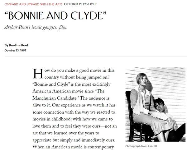 该文不仅为她赢得《纽约客》杂志特约影评人职位(一直写到1991年退休),还一举扭转了《邦尼与克莱德》的命运,为该片次年夺得奥斯卡奖立下汗马功劳,为美国电影业(勉强)跟上大洋彼岸的新浪潮运动出了一份力。