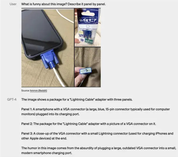 在OpenAI提供的一个示例中,GPT-4准确地回答了几个网络图片为什么搞笑的问题,虽然解释得比较初级,但它确实能准确分析出图片中的各种元素,并分析出它们之间的逻辑。