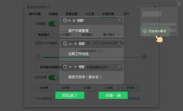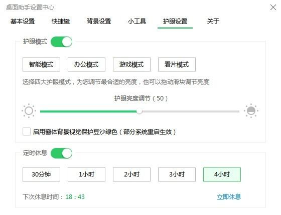 注:桌面助手设置中心可以选择“护眼设置”,根据个人习惯可对护眼模式进行各项参数设置。