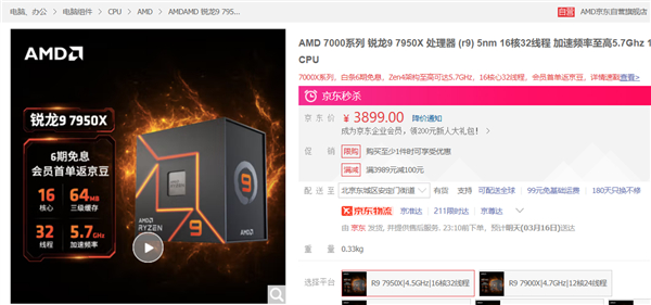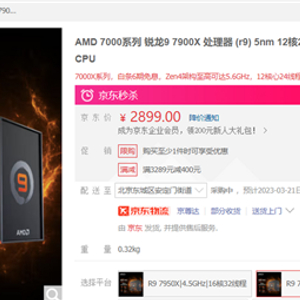 值得一提的是,AMD7000系列锐龙9 7950X处理器的价格为3899元,与之前相比也有100元降价。