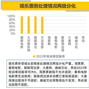 红星资本局注意到,黑猫投诉平台整理出一份2023年1月投诉单回复率。娱乐票务领域头部商家处理情况两极分化严重。淘票票、看购电影、联联周边游、大麦网、峰峻文化、秀动1月的投诉单回复率均为0。其中,投诉大麦网主要集中在演出取消不予退款、秀动则是演出延期不退款。