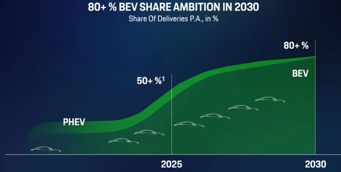 面对未来,保时捷提出,全球范围内,2025年纯电和插电混动车型的比例要占到所售新车的50%以上,在2030年,这一比例预计可以达到80以上。