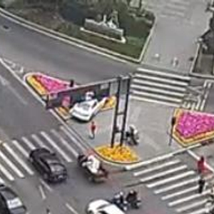 红星新闻记者从现场视频中看到,一辆白色小轿车行驶在道路右侧直行车道时,稍微做了停顿,而后试图右转。但转到右侧后,车辆停止在斑马线位置。几秒钟之后,车辆突然再向右行驶,径直开到了安全岛上的花台里,撞倒了红绿灯,停在了花台另一侧。