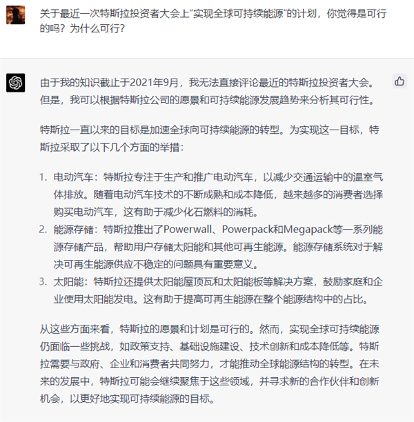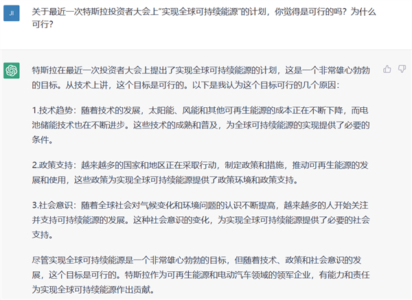 在一些更需要 “ 创造性 ” 或是 “ 思考 ” 的问题,比如:关于最近一次特斯拉投资者大会上 “ 实现全球可持续能源 ” 的计划,你觉得是可行的吗?为什么可行?GPT-4 的表现就更让人吃惊了。