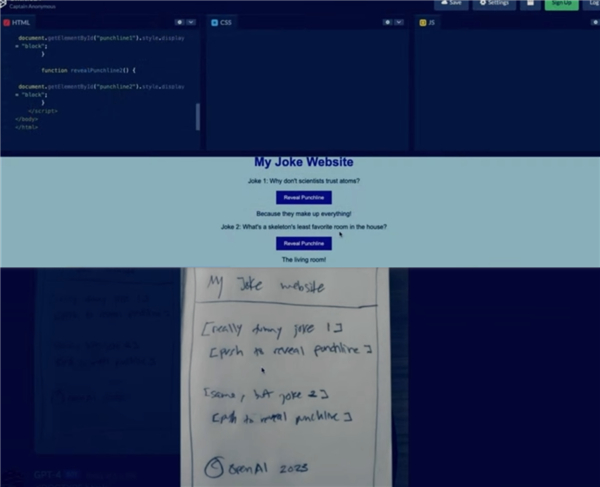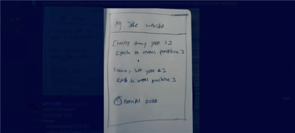 在今天凌晨的官方直播视频中,GTP 的开发人员演示了 GPT-4 可以识别他手绘的一张网页草图,并且根据草图写出网页的前端代码。
