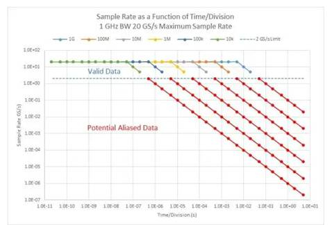 图3.1GHz带宽示波器的采样率与时间/格设置的关系图,采样率为20Gsamples/s。请注意,一旦采样率降至2Gsamples/s或更低,示波器将混叠1GHz的信号。