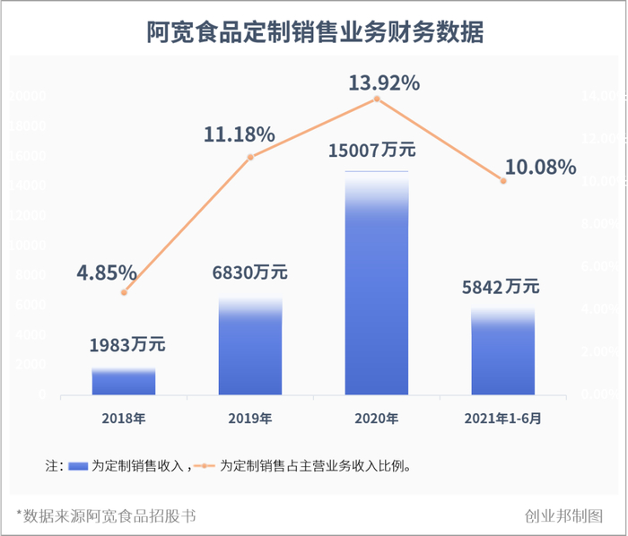 2018年阿宽食品的定制销售业务营收为1983万元,占总营收比为4.85%,2019年上升到6830万元,占比约11%,2020年则狂飙到1.5亿元,占比接近14%。