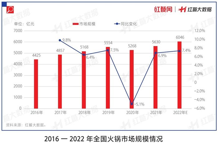 《中国餐饮发展报告2022》显示,火锅市场仍保持着扩容态势。2020年,受疫情影响,我国火锅市场规模减少至5268亿元,随着国内疫情得到缓解,2021年火锅市场规模迎来反弹,达到了5630亿元,2022年预计整体规模将达到6046亿元。