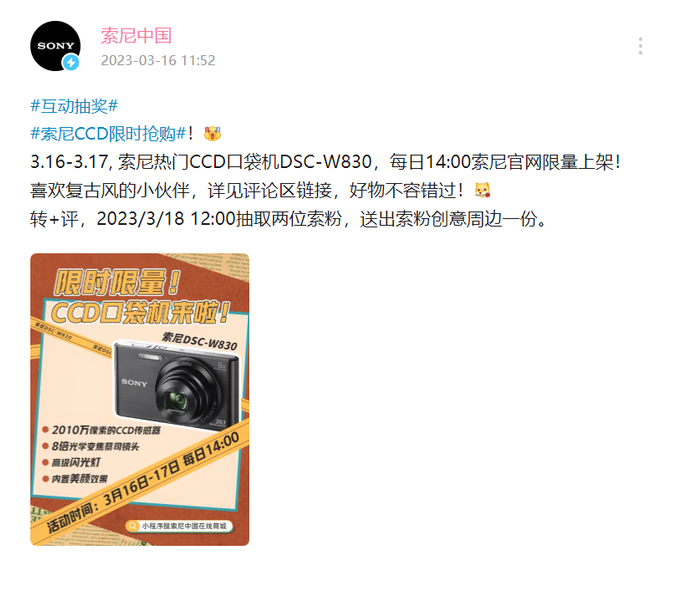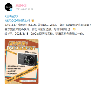 IT之家 3 月 16 日消息,索尼中国宣布,将于 3.16-3.17 每日 14:00 在官网限量上架热门 CCD 口袋机 DSC-W830,定价 749 元。
