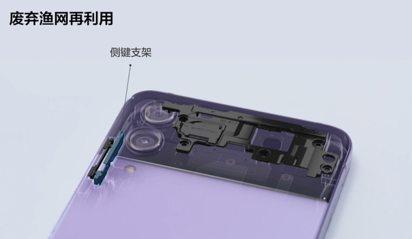 首先,三星Galaxy Z Flip4的侧键支架是由回收渔网制作的。据统计,全球每年约有64万吨渔网被遗弃,是海洋污染的主要原因之一。而三星通过前沿的技术,将回收渔网制作成为了高性能环保材料并用于产品的部件之中,这种方式无疑降低了废料对环境的破坏。