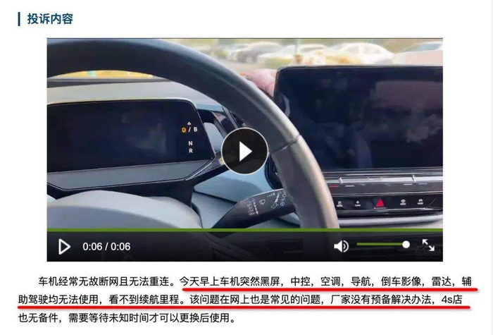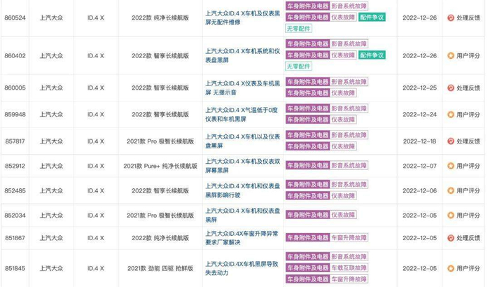大众电气化转型的关键产品ID系列在2022年底被国内车主曝出现大面积车机故障。车质网显示,大众ID系列至今已有多达200多条投诉记录,多数问题都指向了大小屏幕双黑、车机断网频繁、故障码爆出无法行驶等问题,ID.3、ID.4和ID.6等车型均有涉及。