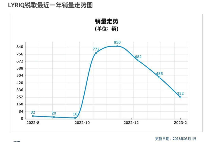LYRIQ口碑持续崩塌之下,在国内市场也面临着哑火的尴尬。据车主之家数据,自2022年10月开始LYRIQ锐歌销量一路走低,2023年2月仅售出252台,自上市以来累计在国内销售为3275台,这个数字还不及特斯拉2月零售销量的十分之一。