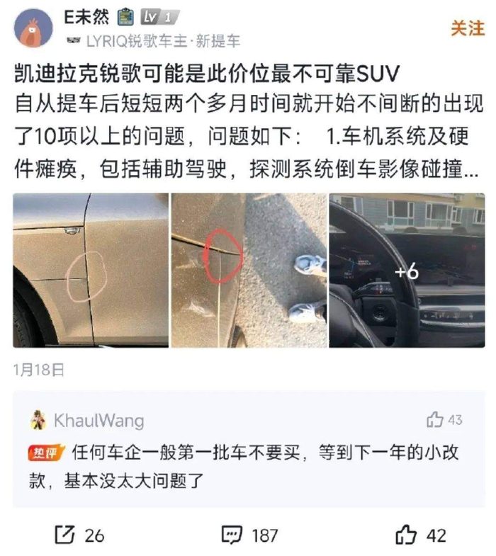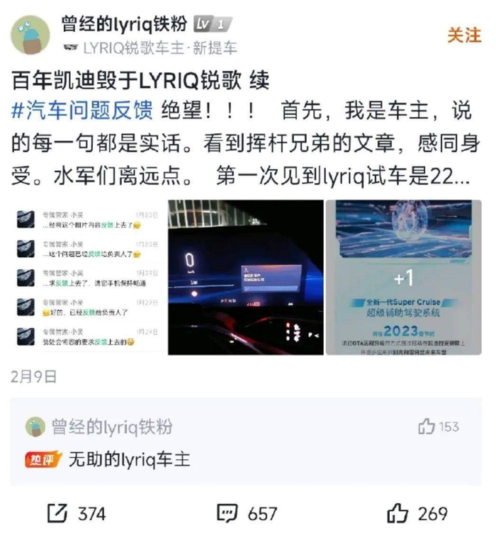 跟李先生一样走上维权道路的车主很多,山西的一位车主网名“曾经的lyriq铁粉”。在无数电车中选择了LYRIQ作为人生第一辆座驾的他,现在悔不当初。“粉转黑”“黑转死心”后,他在一则帖子中愤然写下自己的感受:“百年凯迪毁于LYRIQ,绝望!!!”