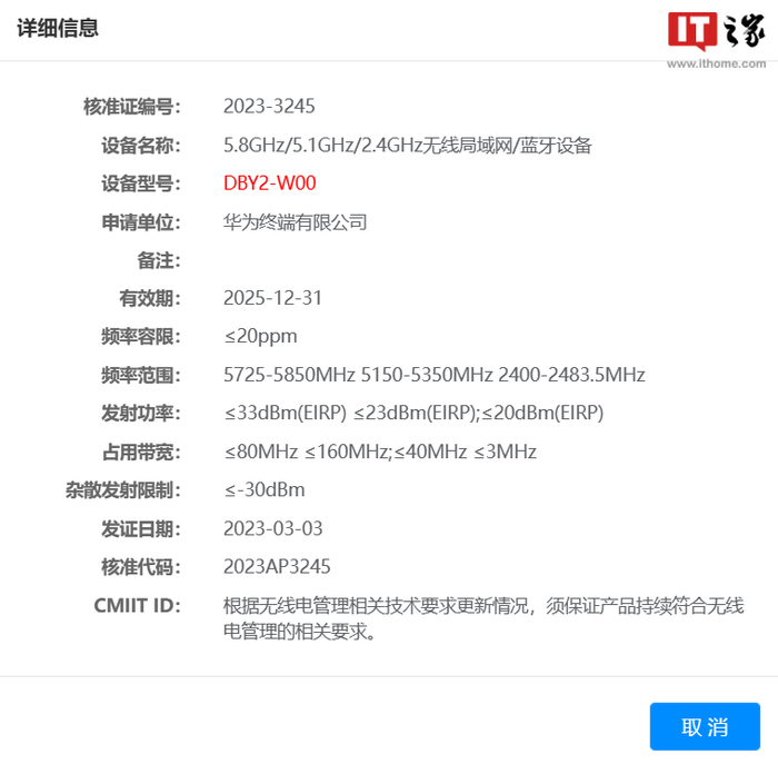 华为终端有限公司此前一款型号为 DBY2-W00 的设备通过工信部无线电核准,预计为华为 MatePad 11 2023 款,支持双频 WiFi。IT之家附上相关认证: