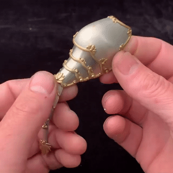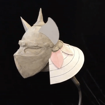 下面这个猫咪头盔是钢制的,先让它故意生锈,接着再进行清洗,让表面布满划痕,凸显了它的老化与年代感。