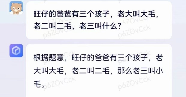 从问答结果来看,不能简单咬定文心一言不聪明,毕竟它没有按部就班地认为第三个孩子就得叫“三毛”,因为它认为可以叫“小毛”,这道脑筋急转弯题人类答错的也不在少数。