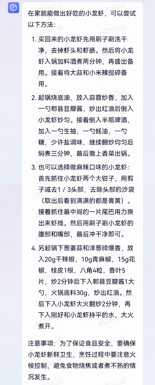 文心一言在食物烹饪上比较有经验,从清洗备菜到具体烧制,其都给出了详细的操作步骤。另外,文心一言还贴心地提示:小龙虾要买干净卫生的、烹饪要小心火候。