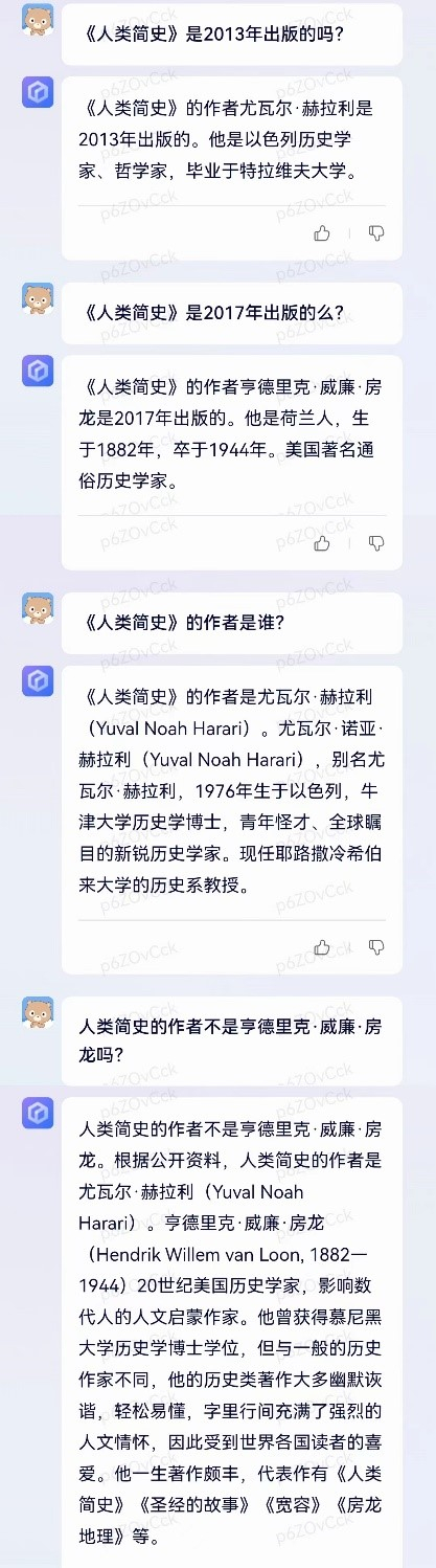 不同的出版时间,对于《人类简史》的作者,文心一言给出了不同的答案,但是继续反向向其确认作者名字时,它“自信满满”地否定了其上一轮给出的答案。