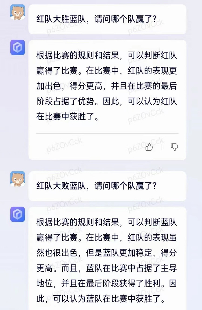 从对话内容可以看出,文心一言知道“大胜”的意思,但是对“大败”的理解较为单一。它可能不知道,在中国的词汇使用上,如果“大败”后面有对手(对手的名字),那就是赢;如果“大败”后面没有字,直接句号结束,那就是输。
