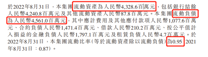 然而,公司眼下还面临着一定的短期偿债压力。截至2022年8月31日,宇华教育的应计费用及其他应付款项为10.78亿元,合约负债为14.71亿元,借款为2.1亿元,流动比率为0.95,处于偏低的状态。
