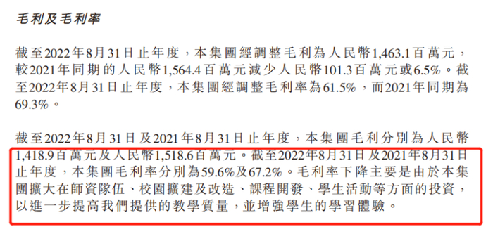 不可忽视的是,宇华教育的利润数据并非完美。2022财年公司的所得税前利润为11.26亿元同比下降34.09%。毛利同比减少6.56%至14.19亿元。毛利率也从2021财年的67.2%下降至59.6%。
