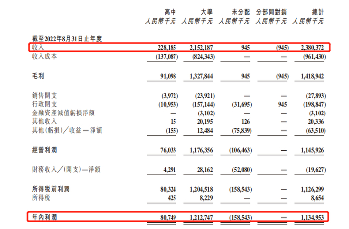 截至2022年8月31日止年度,宇华教育实现营收23.8亿元,同比增长5.39%。其中,来自高中的收入为2.28亿元,来自大学的收入为21.52亿元。年内利润为11.35亿元,同比增长33.1%。对于收入增加的原因,宇华教育称主要是由于多所学校的招生人数及学费有所增加。