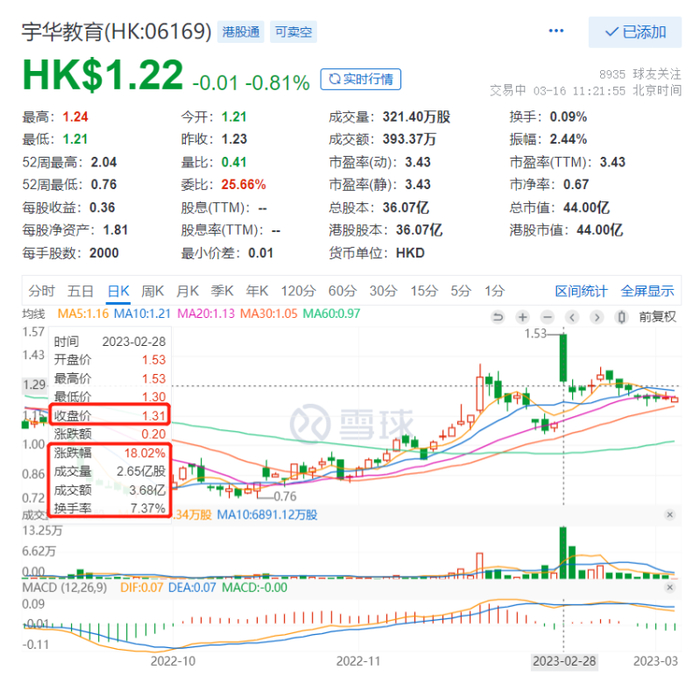 2月最后一个交易日,停牌三月的宇华教育复牌交易,首日股价涨幅一度超过37%,最终报收1.31港元/股。