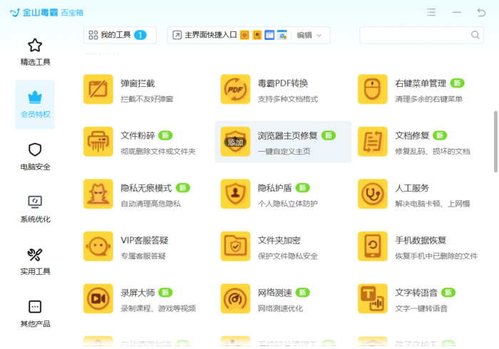 金山毒霸青春版还另外提供二十多项小工具,不管是文档格式转换,还是数据恢复,亦或是磁盘清理等等,你在学习、工作中遇到的种种问题,只要开通金山毒霸会员,统统都可以帮你解决,不再因为第三方小工具夹带病毒或流氓插件而烦恼。