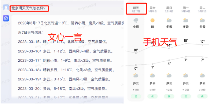 GPT-4发布后的第二天,百度“顶着压力”,推出了自己的新一代知识增强大语言模型——“文心一言”。一开场,别着白色裤腰带走上舞台的百度创始人、董事长兼首席执行官李彦宏,便放低姿态道,“文心一言对标ChatGPT甚至是对标CGT-4,门槛是很高的,全球大厂还没有一个做出来,百度是第一个,我自己测试感觉还是有很多不完美的地方。”真实的文心一言如何?新浪财经对比ChatGPT对文心一言进行实测,一窥“文心一言”发布后的真实表现。实测:实时信息获取有亮点,内容准确性不足在输入“北京明天天气怎么样?”“刘备和曹操谁活得更久?”等问题,以及提出“请写一篇文心一言PK ChatGPT的实测稿件”,“写一篇太空旅行的市场分析报告”,“生成一幅有马和飞机的水墨画”等操作指令后,文心一言先后给出的答案,有的表现相比此前OpenAI发布的ChatGPT也不遑多让,而有的则又相对存在不足。提问“明天天气怎么样等问题时”,文心一言列出的数据,与目前手机上显示的数据基本一致。而由于ChatGPT此前所收集的数据仅截至2021年,并不具备查询实时数据的能力,自然也无法获取到更加精确的天气预报这一类数据。