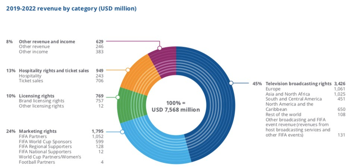 国际足联的赚钱方式和手段早已不是新鲜话题,耳熟能详的电视转播权、营销权(Marketing rights)、许可权(Licensing rights)、门票销售等,都比上一周期有大幅提升。电视转播权收入达34.26亿美元,较上一周期增长10%,欧洲以10.61亿的价格成为区域版权市场价格之最。