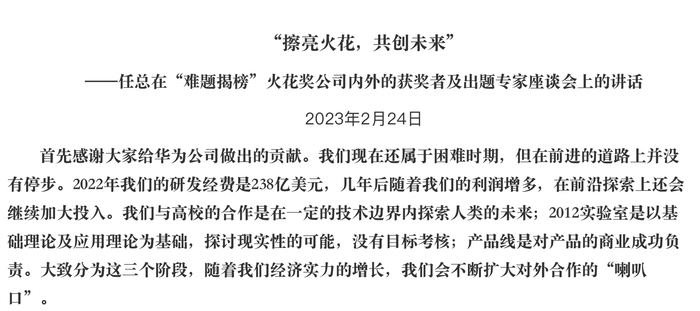 华为创始人任正非近期在“难题揭榜”火花奖公司内外的获奖者及出题专家座谈会上表示,华为现在还属于困难时期,但在前进的道路上并没有停步。“2022年我们的研发经费是238亿美元,几年后随着我们的利润增多,在前沿探索上还会继续加大投入。”