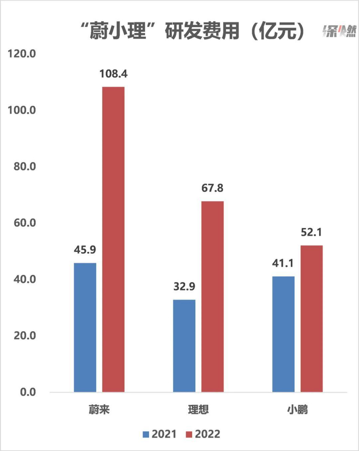 三家公司都舍得在研发上花钱。蔚来、理想、小鹏去年的研发费用分别为108亿元、68亿元、52亿元,相比2021年有大幅度增长。尤其是蔚来和理想,研发开支都翻倍了,且超过了小鹏。
