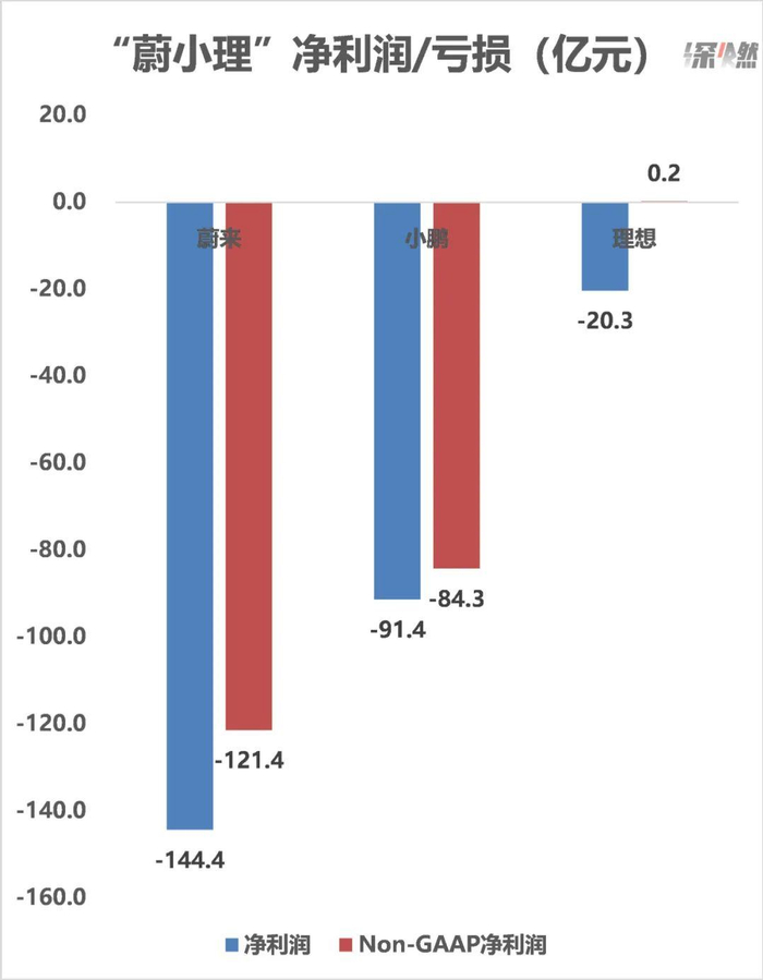 在衡量赚钱能力的终极指标——净利润上,三家公司都是亏损的,蔚来净亏损144亿元,理想20亿元,小鹏91亿元,比2021年大幅提高。如果把股权激励等干扰因素排除,在非公认会计准则之下,蔚来、小鹏的亏损金额依然高达121亿元、84亿元,理想则实现微盈利2082万元。