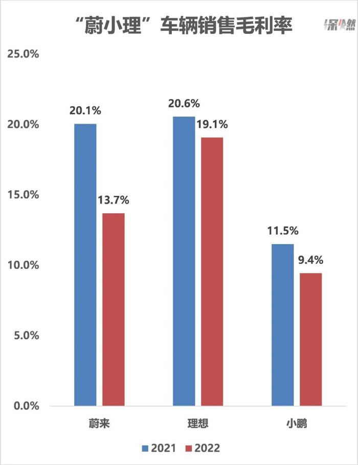 蔚来的车辆销售毛利率,从2021年的20.1%下降到2022年的13.7%;理想从20.6%降到19.1%;小鹏从11.5%降到9.4%。车卖得更多了,但盈利空间更小了。