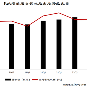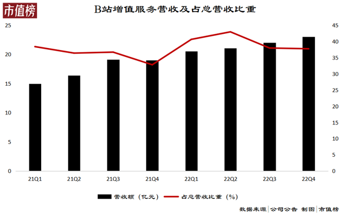 从2020年Q4到2022年Q3,B站增值服务(主要由直播、大会员收入等组成)的营收逐年上涨,在总营收中的占比也逐步提升,从32%提升至42%。但2022年第四季度,23亿元增值服务营收在总营收中的占比回落至37.7%。