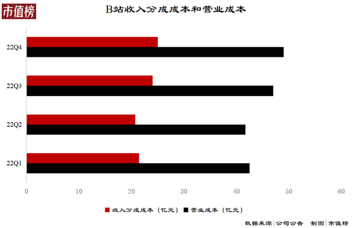 B站财报显示,2022年,营业成本为人民币49亿元,较2021年同期增加4%。主要是由于收入分成成本及内容成本增加所致。其中,收入分成成本为人民币25亿元,占比过半。