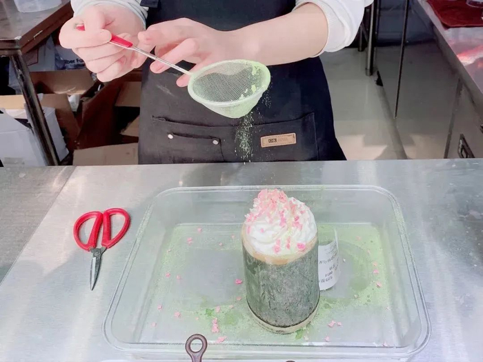 几种茶汤和乳制品调配好的基底,已经提前预制好,只需拿起竹筒接一杯,打奶油顶,撒冻干果粒,再插上两片和竹叶很像的芭蕉叶,就完成了。